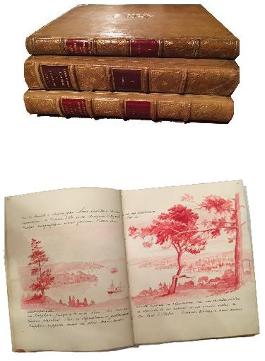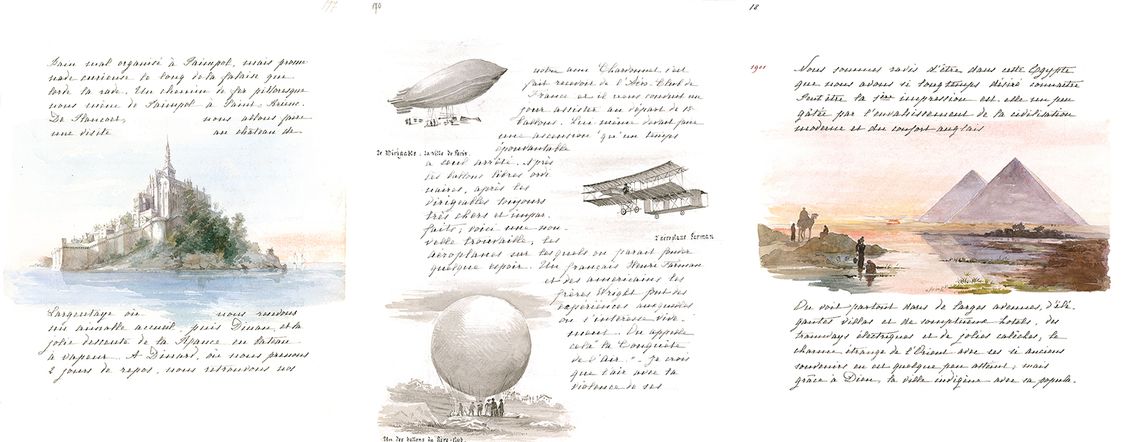 Ce remarquable ensemble de 3 ouvrages illustrés, conservé dans la bibliothèque du Baron et de la Baronne d’Aligny au château de Montmirey la Ville (39), retrace à la fois les évènements familiaux, les nombreux voyages que fit Blanche Ménans en Italie, Espagne, Russie, Terre Sainte... ses visites dans les propriétés familiales et ses observations sur un monde en pleine évolution.